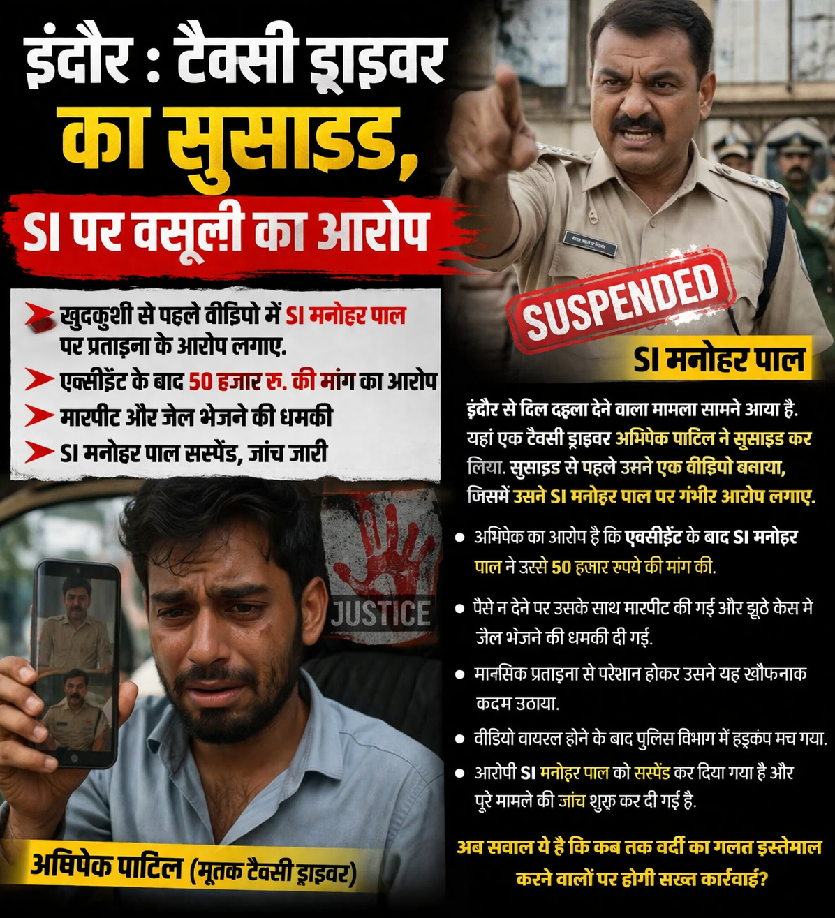 मध्य प्रदेश इंदौर: के राजेंद्र नगर थाना क्षेत्र से एक दिल दहला देने वाली घटना सामने आई है। यहां एक टैक्सी ड्राइवर ने आत्महत्या कर ली। आत्महत्या से पहले बनाए गए वीडियो में मृतक ने राजेंद्र नगर थाने में पदस्थ सब-इंस्पेक्टर मनोहर पाल पर गंभीर आरोप लगाए हैं।