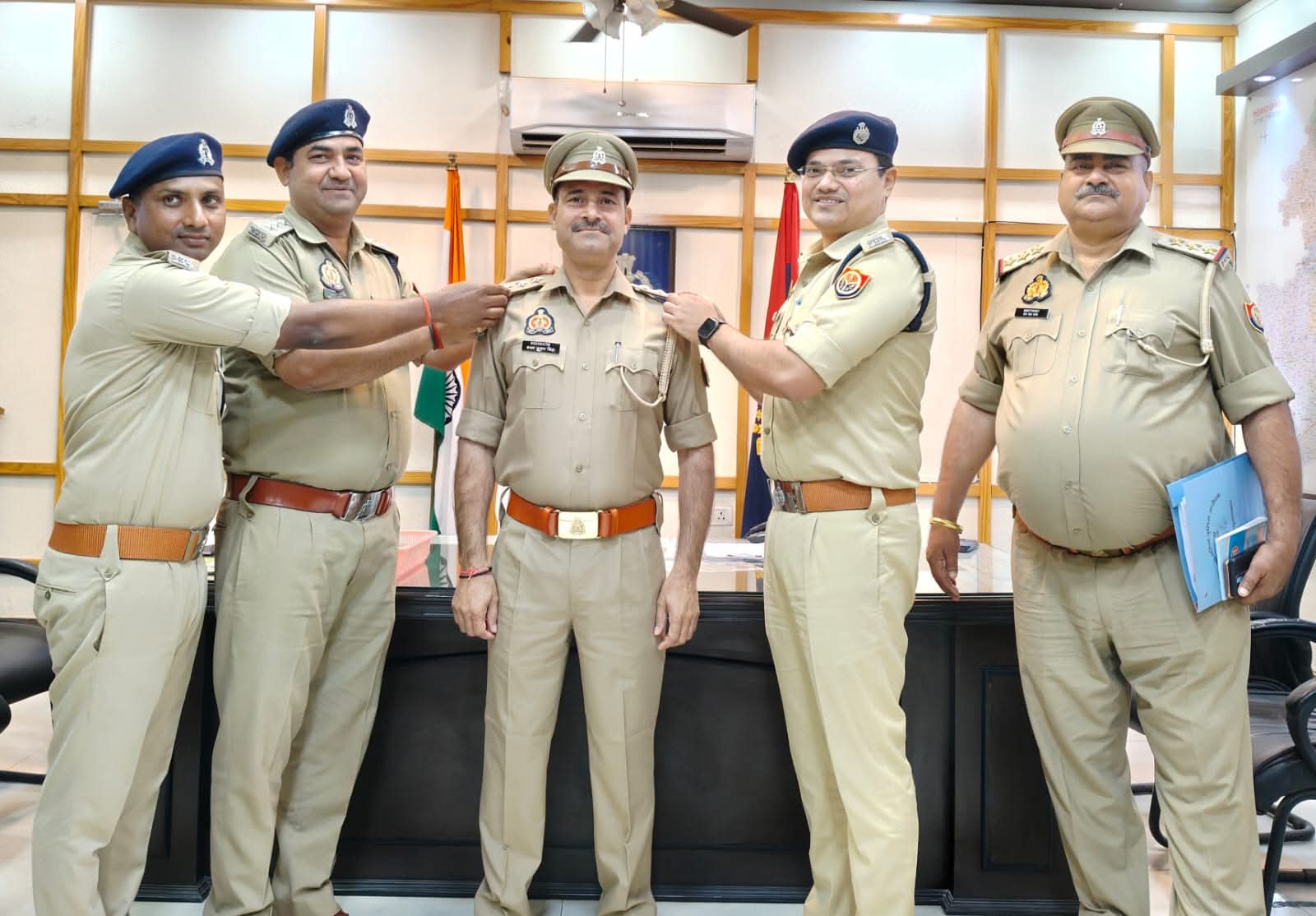 पदोन्नत हुए अधिकारियों को पुलिस अधीक्षक ग्रामीण, मुरादाबाद द्वारा स्टार लगाकर किया गया सम्मानित।