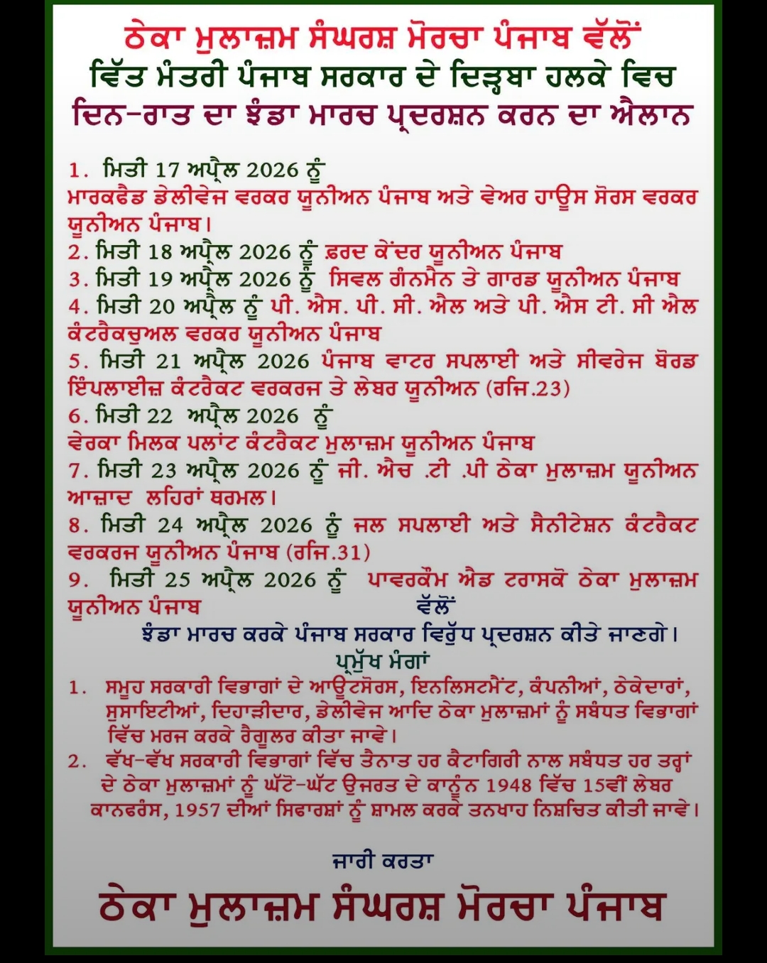 ਠੇਕਾ ਮੁਲਾਜ਼ਮ ਸੰਘਰਸ਼ ਮੋਰਚਾ ਪੰਜਾਬ ਵੱਲੋਂ ਲਗਾਤਾਰ ਧਰਨੇ ਚਾਲੂ।