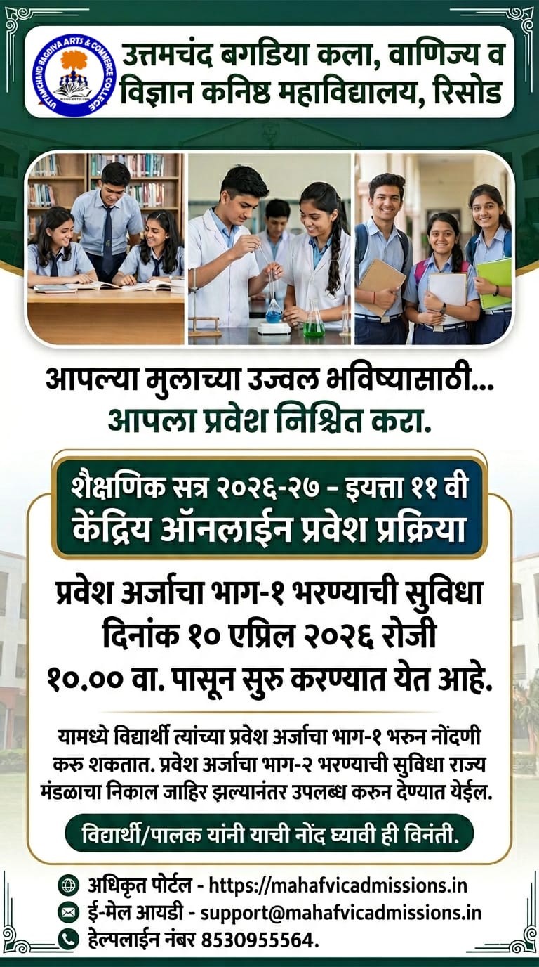 रिसोड (प्रतिनिधी) : महाराष्ट्र राज्य माध्यमिक व उच्च माध्यमिक शिक्षण मंडळाच्या १० वीच्या परीक्षा संपन्न होताच, शैक्षणिक वर्ष २०२६-२७ साठीच्या ११ वी (FYJC) केंद्रीय ऑनलाइन प्रवेश प्रक्रियेला आजपासून अधिकृत सुरुवात झाली आहे. रिसोड येथील उत्तमचंद बगडिया कला, वाणिज्य व विज्ञान कनिष्ठ महाविद्यालयाचे प्राचार्य डॉ. विनोद कुलकर्णी यांनी यासंदर्भात विद्यार्थ्यांना महत्त्वाचे मार्गदर्शन करत त्वरित नोंदणी करण्याचे आवाहन केले आहे.
