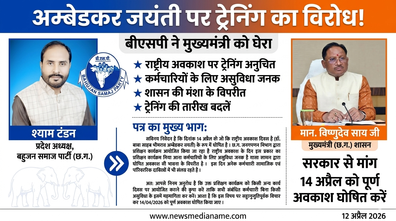 "बाबा साहब की जयंती पर ट्रेनिंग क्यों?" – बीएसपी ने मुख्यमंत्री को घेरा। छत्तीसगढ़ जनगणना विभाग द्वारा 14 अप्रैल को प्रशिक्षण आयोजित करने पर प्रदेश अध्यक्ष श्याम टंडन ने जताई आपत्ति, ट्रेनिंग की तारीख बदलने की मांग।
