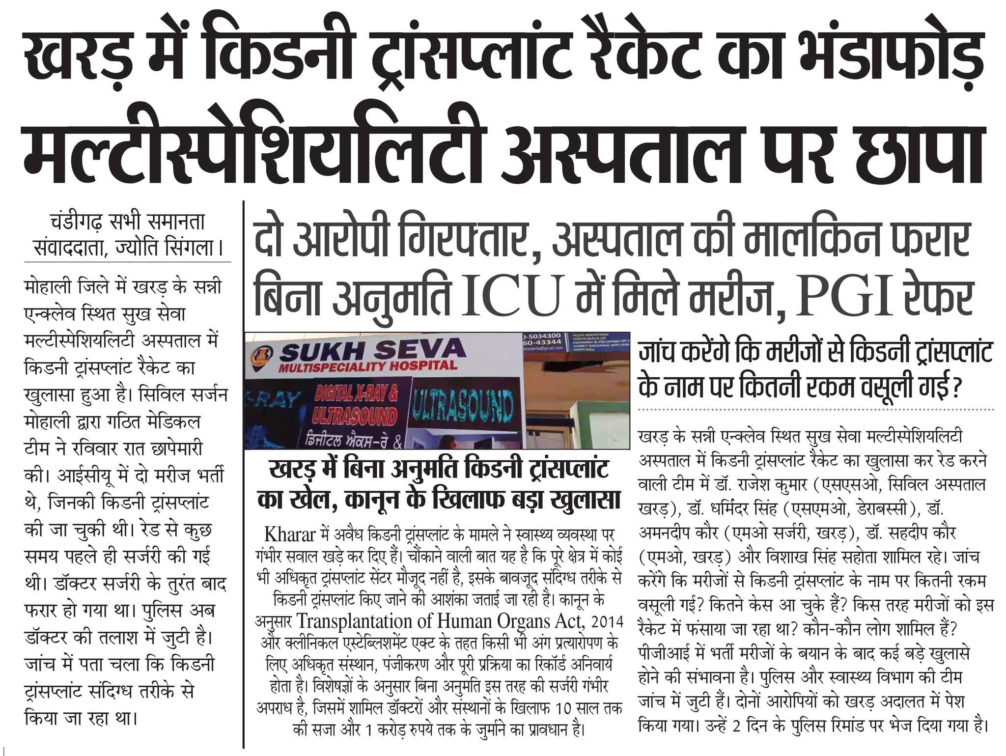 ਖਰੜ (ਮੋਹਾਲੀ ਜ਼ਿਲ੍ਹਾ, ਪੰਜਾਬ) ਵਿਚ ਸੁੱਖ ਸੇਵਾ ਮਲਟੀ ਸਪੈਸ਼ਲਿਟੀ ਹਸਪਤਾਲ (Sukh Sewa Multi Speciality Hospital) ਤੇ ਤਾਜ਼ਾ ਛਾਪਾ ਮਾਰਿਆ ਗਿਆ ਹੈ, ਜਿਥੇ ਕਿਡਨੀ ਟ੍ਰਾਂਸਪਲਾਂਟ ਰੈਕੇਟ ਦਾ ਪਰਦਾਫਾਸ਼ ਹੋਇਆ ਹੈ।