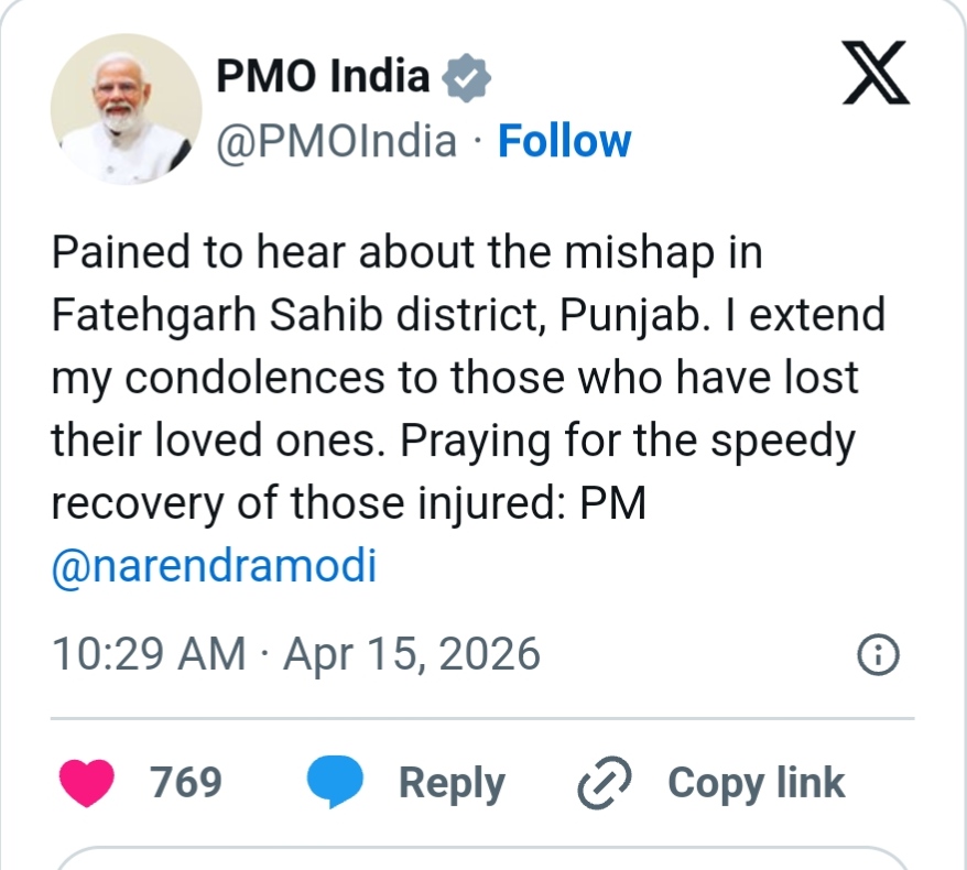 “पंजाब के फतेहगढ़ साहिब जिले में हुई दुर्घटना के बारे में जानकर गहरा दुख हुआ। मृतकों के परिजनों के प्रति मेरी संवेदना है। घायलों के शीघ्र स्वस्थ होने की प्रार्थना करता हूं: प्रधानमंत्री @narendramodi”