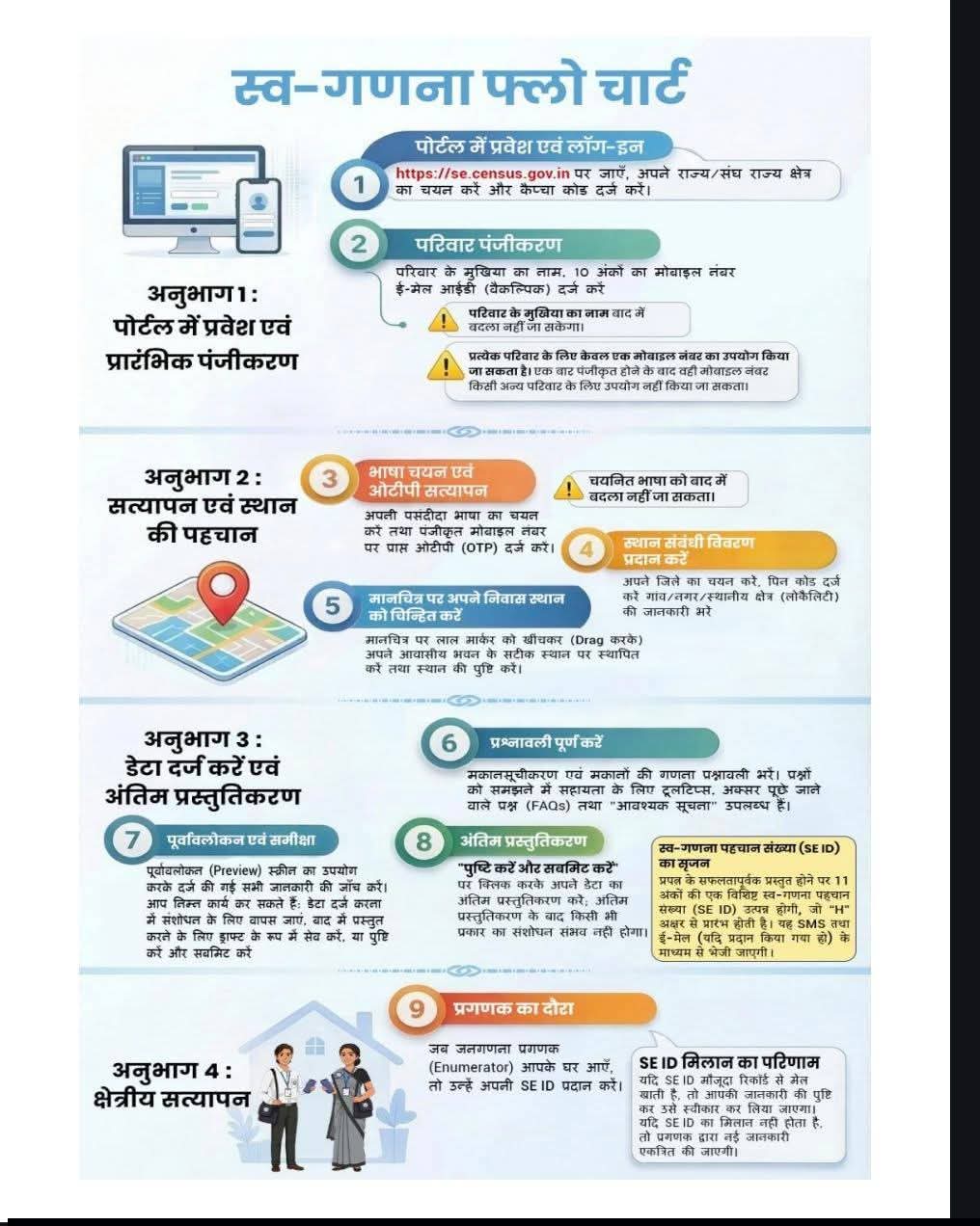 स्व-गणना करने के बाद भी क्षेत्रीय सत्यापन आवश्यक है। जब जनगणना प्रगणक घर-घर भ्रमण के लिए आएंगे, तब नागरिकों को अपनी SE ID उनके साथ साझा करनी होगी। यदि ID का मिलान हो जाता है, तो डेटा को अंतिम रूप से स्वीकार कर लिया जाएगा। मिलान न होने की स्थिति में प्रगणक पुनः जानकारी एकत्रित करेंगे।