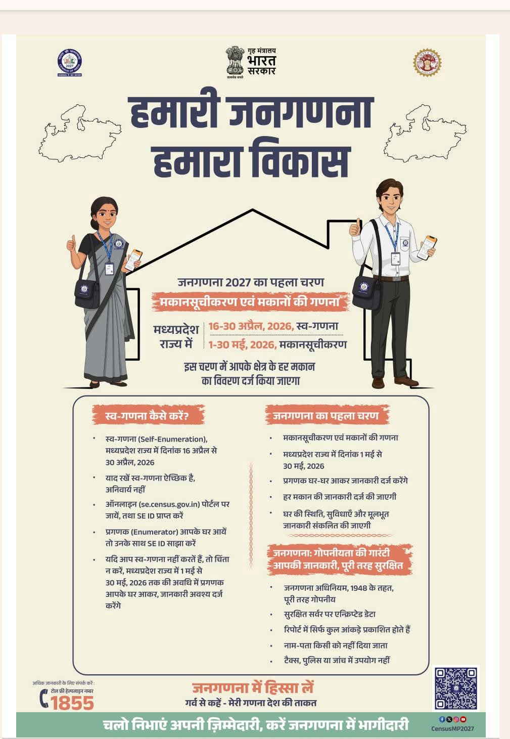 भारत सरकार और मध्यप्रदेश शासन के निर्देशानुसार,जनगणना 2027 के प्रथम चरण “मकान सूचीकरण एवं मकानों की गणना” के लिए स्व-गणना की सुविधा शुरू की जा रही है। इसके तहत जिले के नागरिक अब स्वयं ऑनलाइन माध्यम से अपने परिवार का विवरण दर्ज कर सकेंगे।