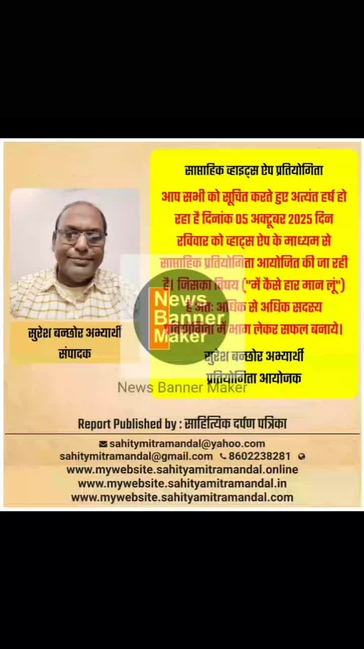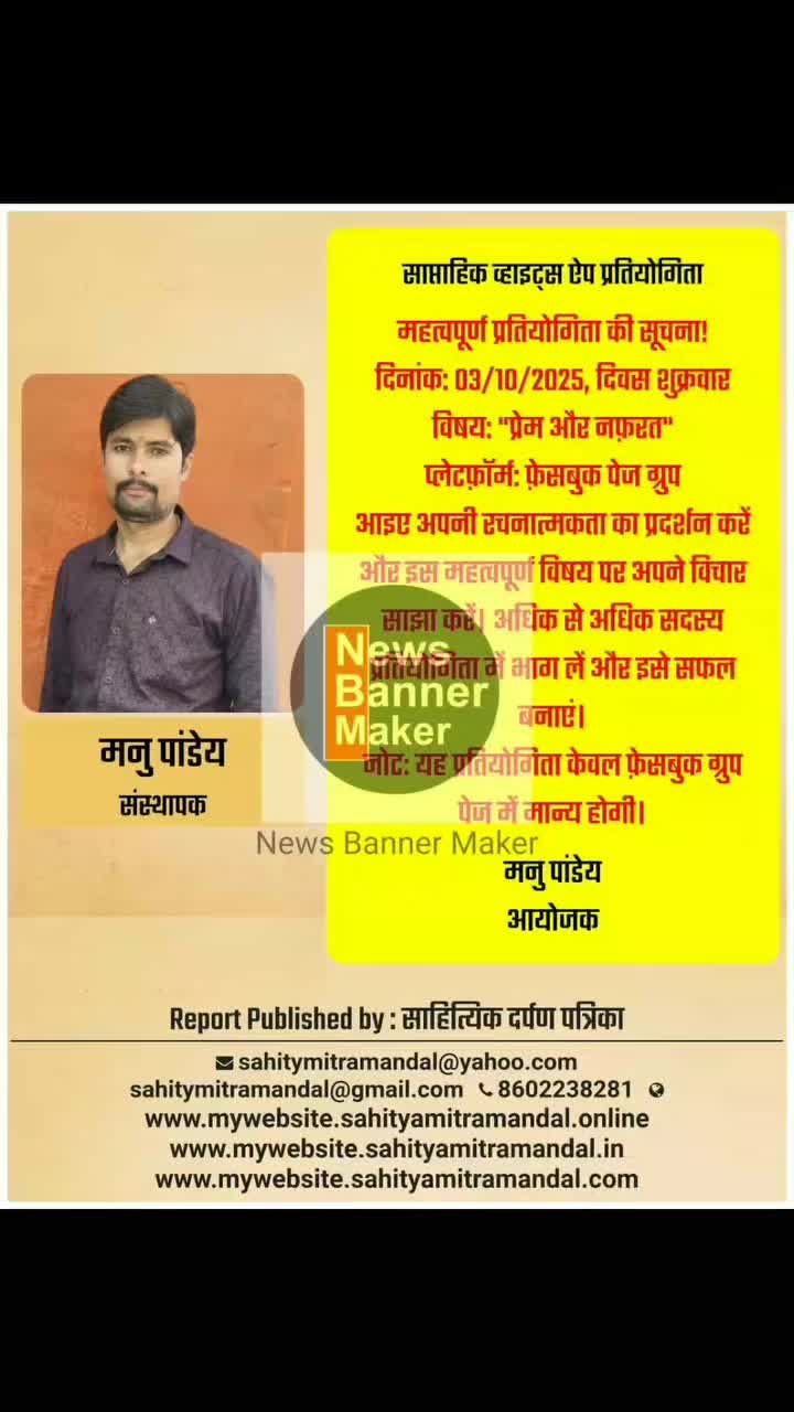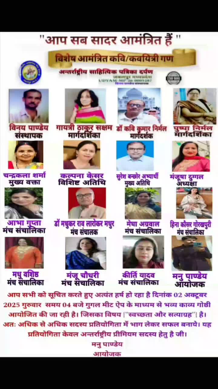 Vinay Kant Katni, Madhya Pradesh (MP) AIMAMEDIA 04/10/2025 10:52 PM Report दिनांक 05 अक्टूबर 2025 वार रविवार को व्हाइट्स ऐप में साप्ताहिक प्रतियोगिता आयोजित हो रही है।.... read more 473 0 comment Vinay Kant Katni, Madhya Pradesh (MP) AIMAMEDIA 01/10/2025 07:57 PM Report दिनांक 03 अक्टूबर 2025 शुक्रवार को फेसबुक पेज पर प्रतियोगिता आयोजित हो रही है।.... read more 144 0 comment Vinay Kant Katni, Madhya Pradesh (MP) AIMAMEDIA 27/09/2025 10:29 PM Report दिनांक 02 अक्टूबर 2025 गुरुवार को गुगल मीट के माध्यम से भव्य काव्य गोष्ठी आयोजित हो रही है।.... read more 375 0 comment Vinay Kant Katni, Madhya Pradesh (MP) AIMAMEDIA 27/09/2025 08:18 PM Report स्वरचित कविता - विषय - बेरोजगार का हाल.... read more 0 0 comment